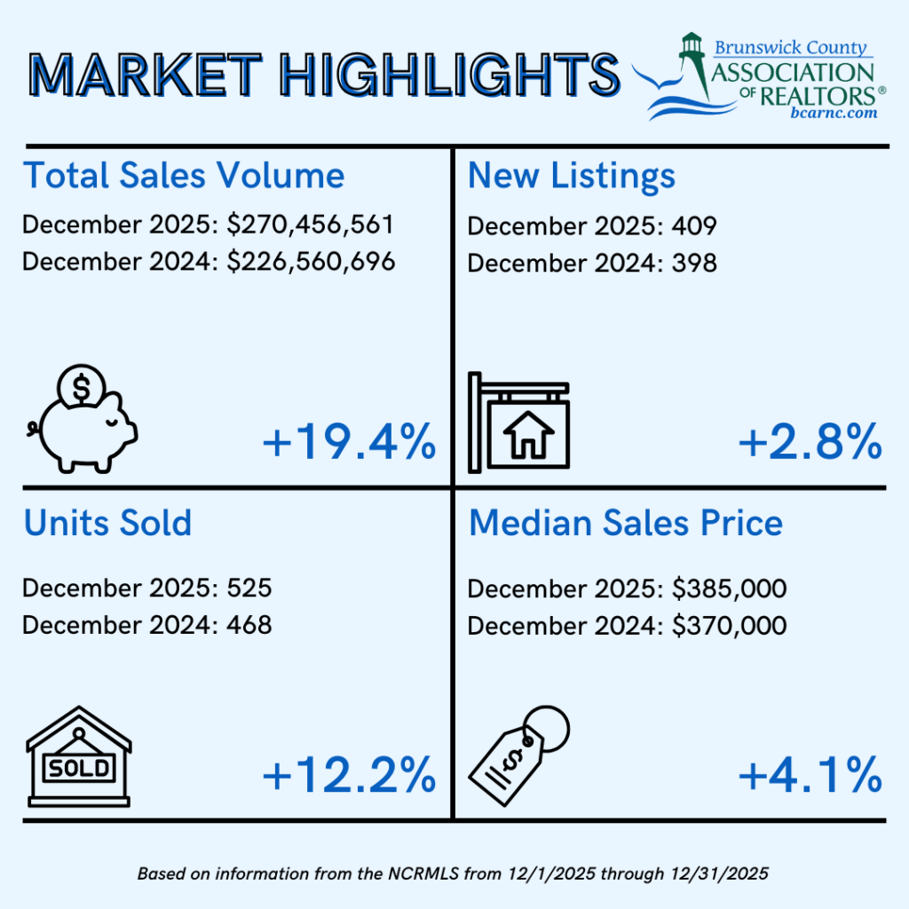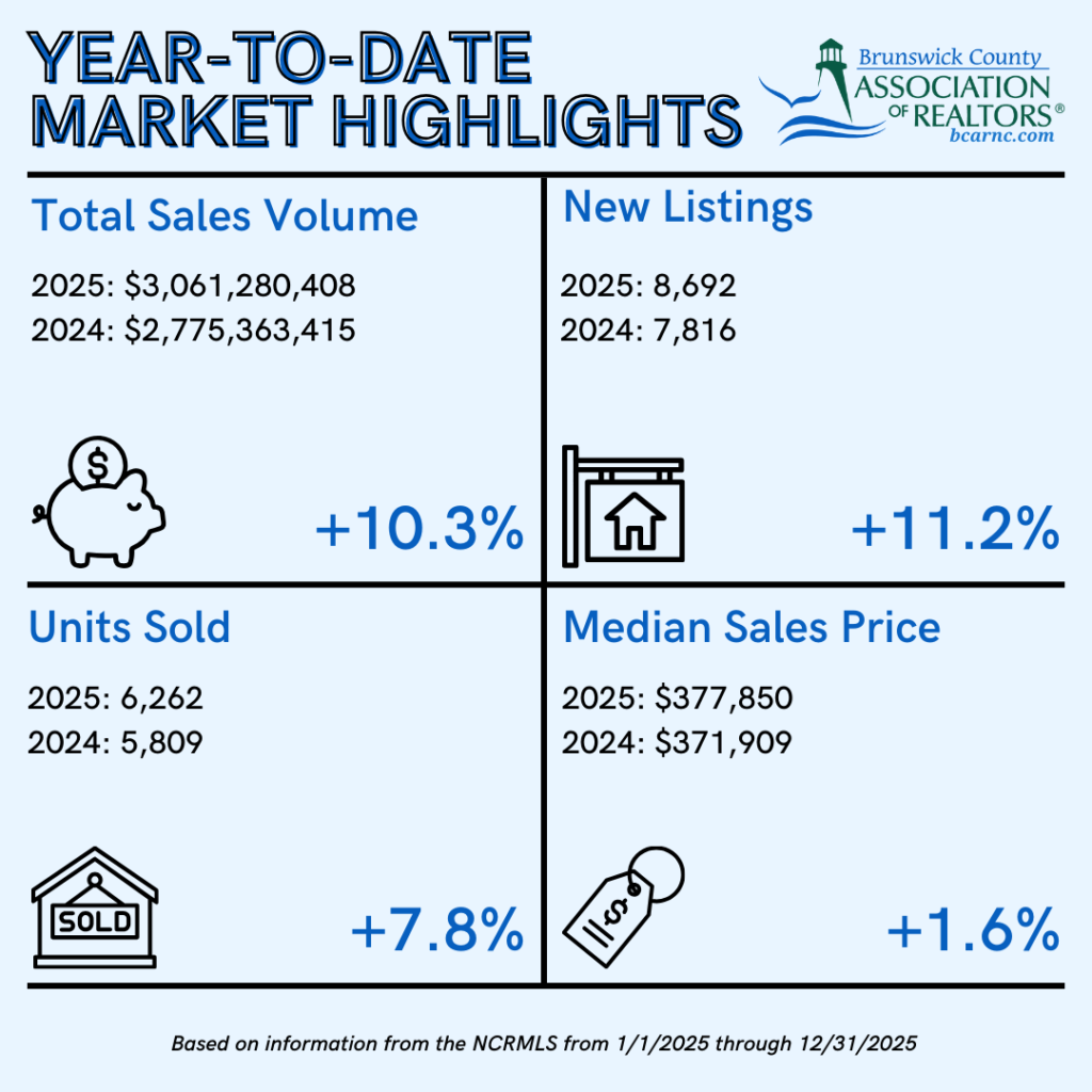 “2025 was a truly historic year for Brunswick County real estate, with more than $3 billion in residential sales for the first time ever,” said Cynthia Walsh, CEO of the Brunswick County Association of REALTORS®. “The consistency we saw in 2025, especially from spring through summer, shows just how strong demand is for homes in our area. It also shows the hard work of over 1,100 BCAR members who represented buyers and sellers throughout the year, selling more than 6,300 homes.”